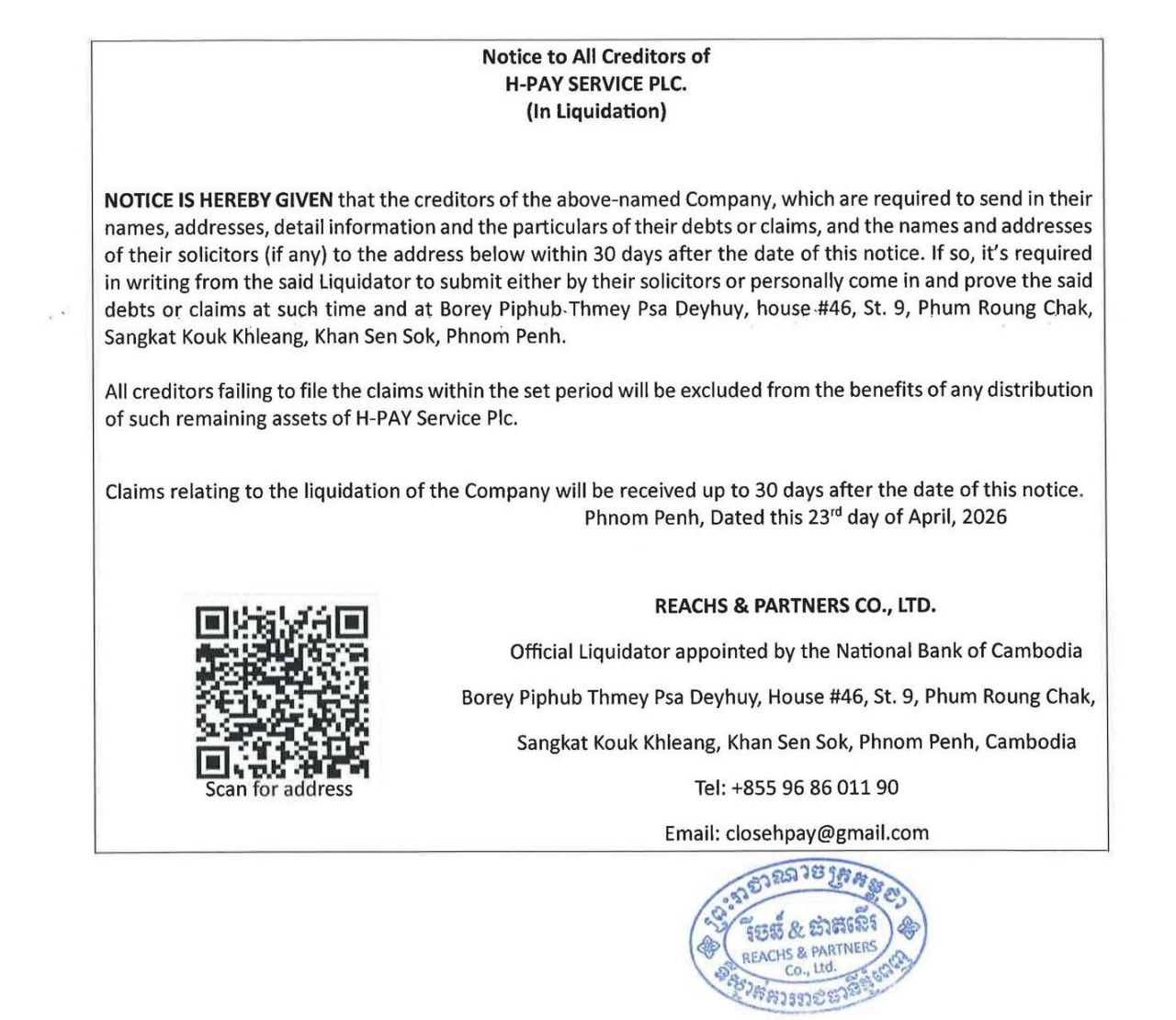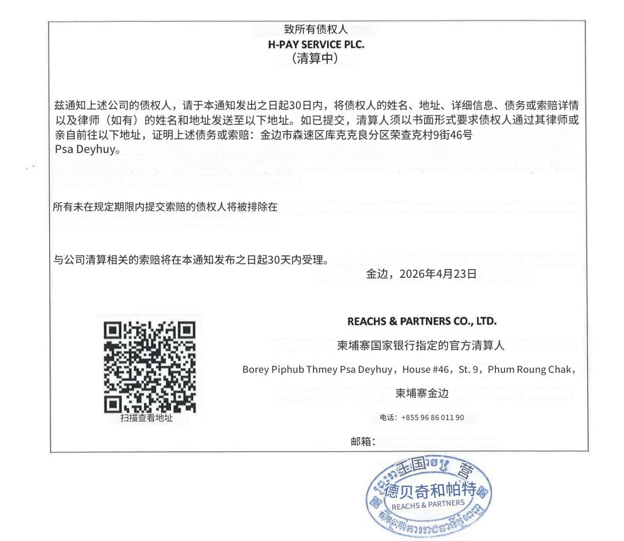 4月23日,柬埔寨国家银行指定的清算人发布正式公告,通知 H-Pay Service Plc.(汇旺)的相关债权人尽快提交债权申报资料,标志着该公司清算程序已正式启动。