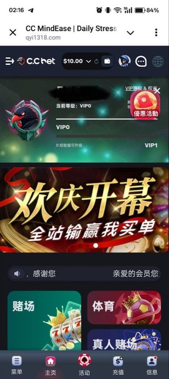 呖咕呖咕 CCbet新用户注册秒10u 到账情况:严禁充值 领取方式:新用户注册秒10u,不限制游戏 安全系数:中 平台资历:自行调查 会员评分:★★☆☆☆ 官方网址:https://www.qyi1318.com/ 流水限制:自行查看
