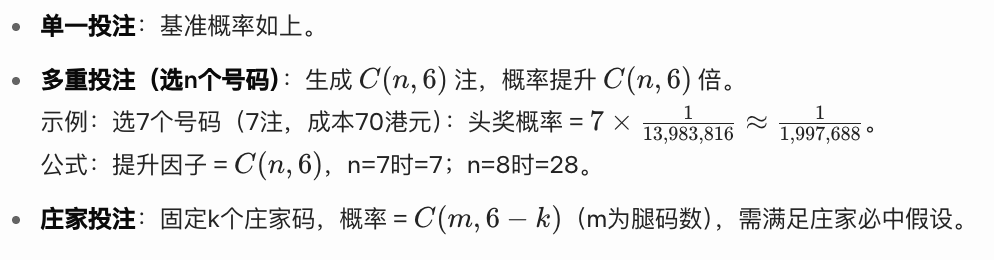 总之,香港六合彩中奖概率由组合数学严谨决定,头奖极低(<0.000007%),7等奖最易(≈0.88%)。通过上述公式,可自行用计算器或Python(comb(49,6) from math)验证。理性看待:娱乐优先,预算控制(<收入5%)。HKJC官网提供历史验证工具,祝计算精准,参与谨慎。