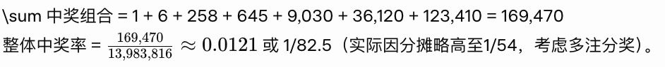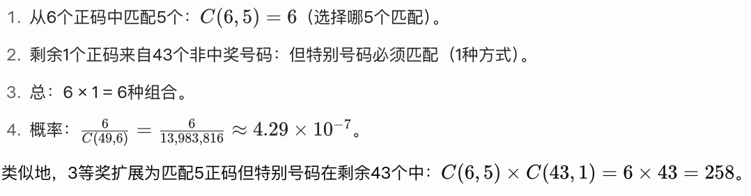 总组合数:参与者选6个号码,抽奖从49个中选6个正码(顺序无关)。