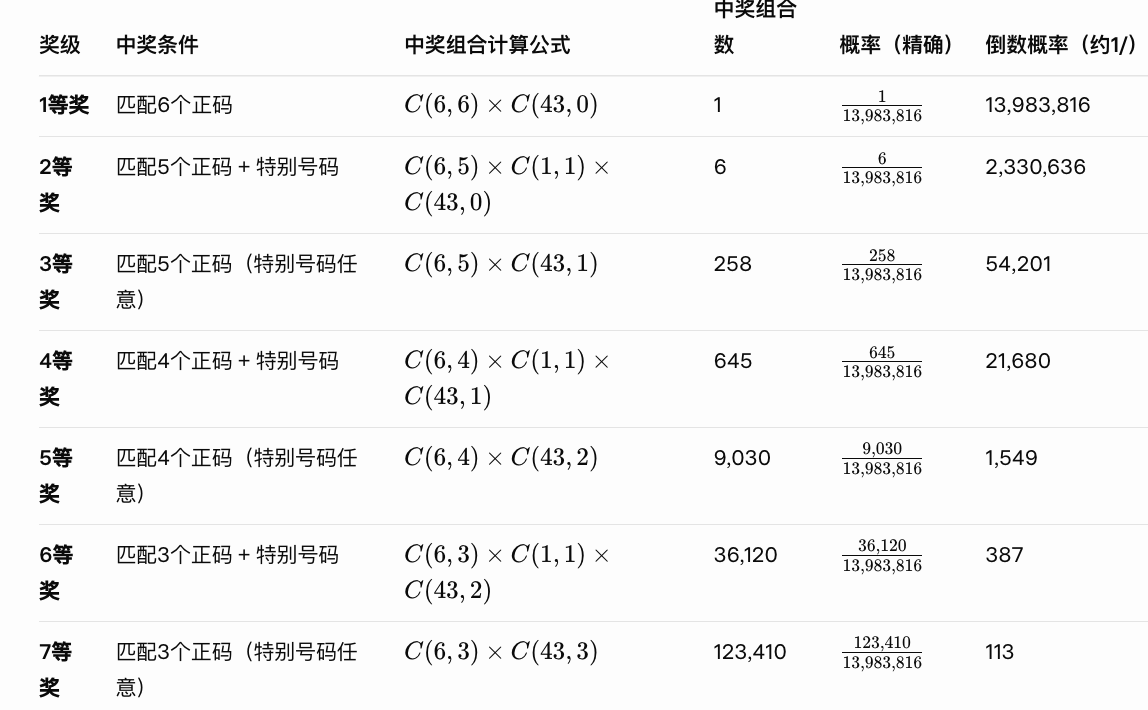 以下表格列出7个奖级的中奖条件、计算公式、精确概率及倒数表示(1/概率)。概率 = 中奖组合数 / 总组合数。