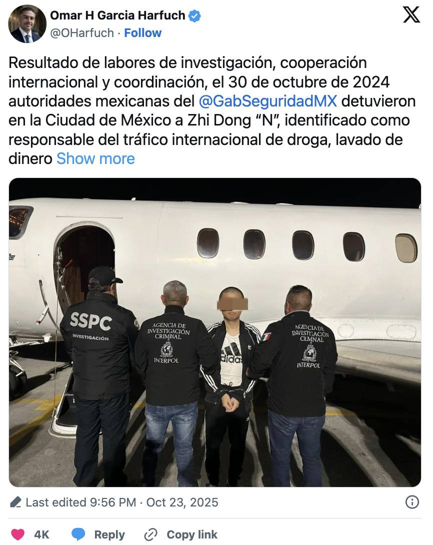 此案发生在特朗普政府强化芬太尼危机应对的背景下,美国指责墨西哥贩毒集团为合成毒品主要来源,并施压中国控制前体化学品出口。 专家如乔治梅森大学教授瓜达卢佩·科雷亚-卡布雷拉(Guadalupe Correa-Cabrera)指出,此次引渡或系美墨最新安全协议产物。